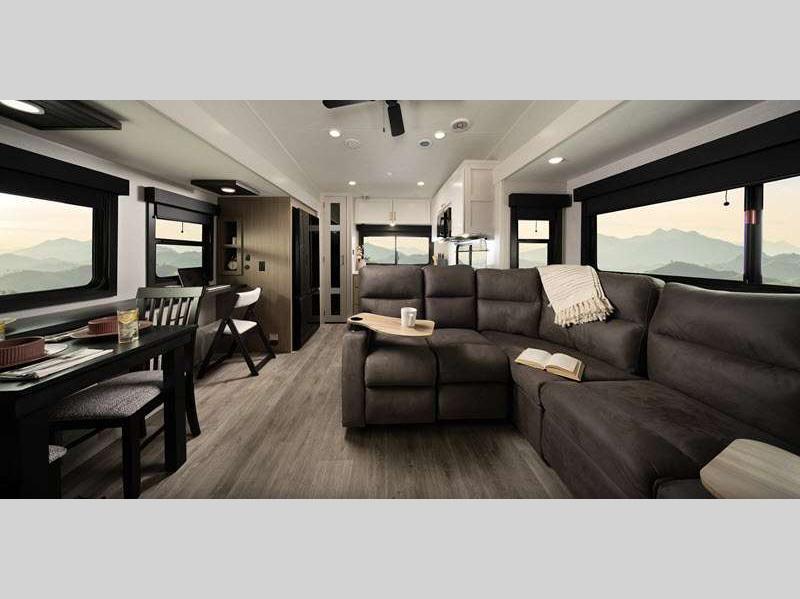 Sleeps 4 Slides 3 Length 36 ft 7 in Ext Width 8 ft 1 in Ext Height 13 ft 4 in Int Height 8 ft 8 in Interior Color Calli Linen Hitch Weight 2270 lbs GVWR 13200 lbs Dry Weight 11145 lbs Cargo Capacity 2130 lbs Fresh Water Capacity 81 gals Grey Water Capacity 87 gals Black Water Capacity 50 gals Tire Size ST235/80R16H Furnace BTU 35000 btu Available Beds King Refrigerator Type 12V Refrigerator Size 16 cu ft Cooktop Burners 3 Shower Size 30" x 48" Number of Awnings 2 LP Tank Capacity 30 lbs Water Heater Type Tankless AC BTU 30000 btu TV Info LR 50" 4K Ultra HD Smart TV Awning Info 10' 6" and 17' Electric with dimmable LED lights Axle Count 2 Washer/Dryer Available Yes Number of LP Tanks 2 Shower Type Standard Electrical Service 50 amp Solar Wattage 200 watts Similar Floorplans