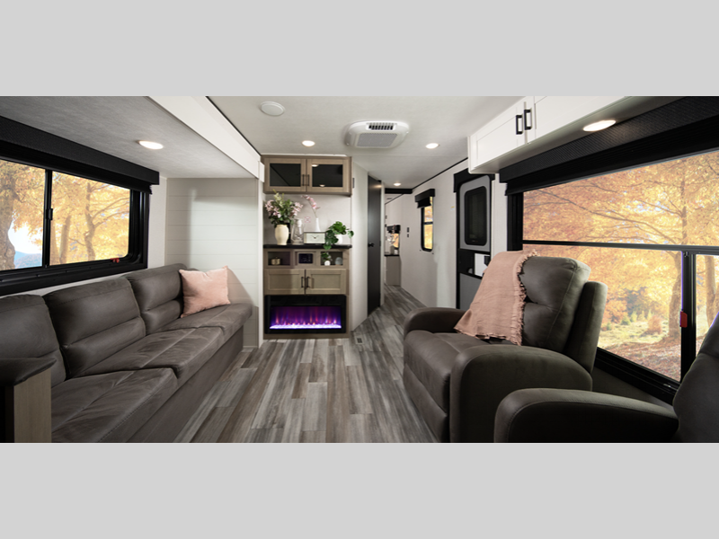 Each model is constructed with a Magnum Truss roof system, which is one of the strongest roofs in the industry, capable of withstanding 50% more weight. The axle(s) with electric, self-adjusting brakes and easy-lube hubs will make towing easier than ever, and the stabilizer jacks will give you peace of mind as you set up camp. Inside, you'll love the residential-style kitchen countertops and vinyl flooring throughout, plus there is an on-demand tankless water heater on board for hot water when you need it!